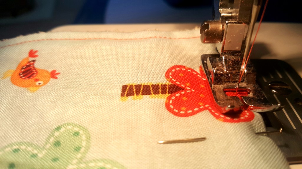Etape 2 : coudre à 0,5 du bord environ (pour me repérer j’ai mis le bord droit de mon pied…celui de la machine à coudre bande de nouilles, pas le mien… sur le bord du tissu) et laisser une ouverture de quelques centimètres. Ça sert à quoi ??? A retourner ! Ben oui, si on ne laisse pas un trou on va se retrouver avec une super lingette à l’envers ! Je rappelle que le joli côté du tissu est à l’intérieur !!