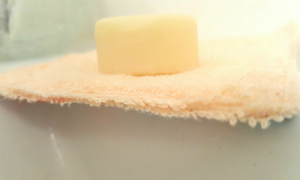 Il se présente de manière solide en forme de galet (ici en format voyage car je voulais tester). Vous remarquerez comme il est délicatement posé sur une lingette démaquillante faite par mes petites mains (Tuto à retrouver ici). C’est pratique, comme ça il est toujours posé sur mon lavabo de salle de bain.