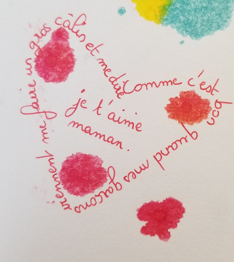 Mon cœur palpite très vite au moment où nous donnons nos impressions. Je ne sais pas trop pourquoi. Je pense tout simplement que cette méthode ne laisse pas le cœur indifférent. Je suis persuadée qu’il s’agit d’un bel outil pour s’exprimer et faire surgir des sentiments auxquels on ne s’attends pas forcément. Une vraie thérapie !