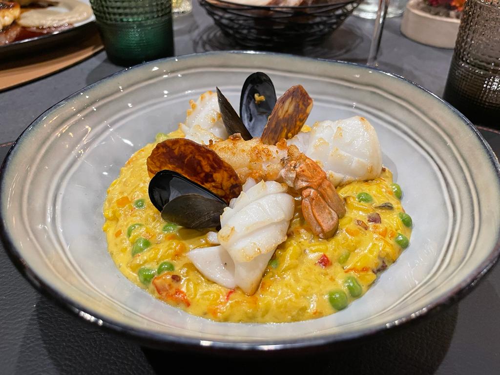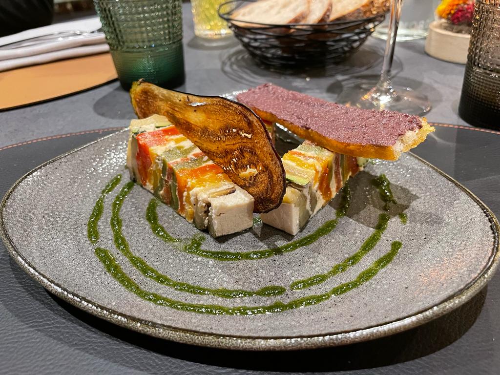 Pour ma part, j’ai pris ensuite du Bar grillé, déclinaison d’artichauts, jus tranché au chorizo ibérique. Et je dois dire que je me suis fais plaisir. C’était délicieux. La sauce avait un petit goût un peu corsé qui se mariait bien avec la douceur du bar. Mon chéri s’est laissé tenter en entrée par un Feuille à feuille de légumes d’été, toast croustillant aux olives puis en plat par un Risotto crémeux comme une paëlla. J’avoue que ça avait l’air bon aussi mais j’avais déjà bien assez à manger de mon côté. J’ai quand même goûté l’entrée qui était très fraîche donc parfaite dans son rôle de début de repas.