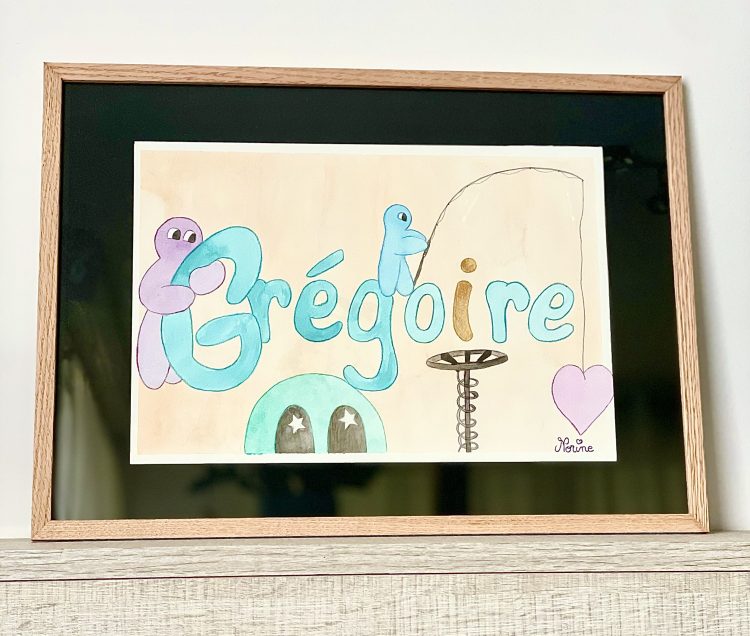 Pour le petit Grégoire, j’ai tenté une autre technique. J’ai d’abord recouvert tous les personnages et les lettres de drawing gum (gomme à masquer) pour faire le fond. Ensuite j’ai peint les personnages et le prénom. Puis j’ai marqué les contours au crayon de couleur.