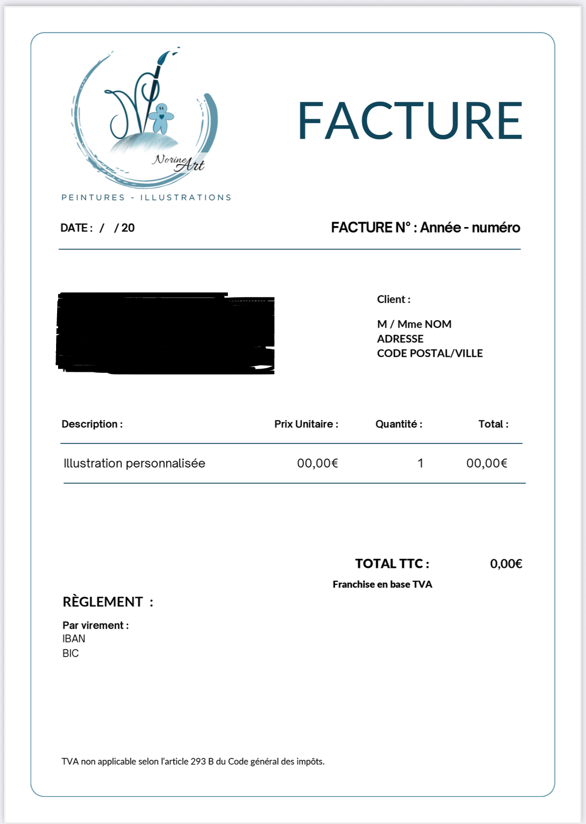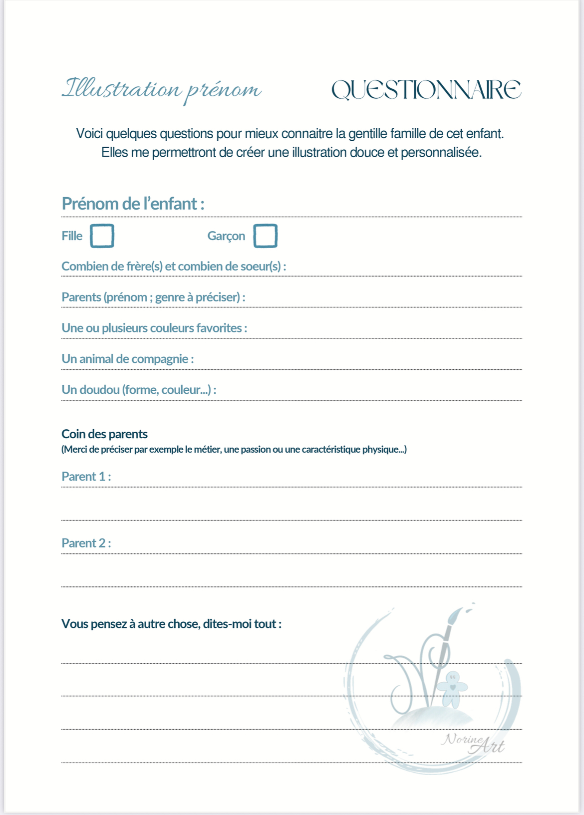 Il fallait aussi préparer un questionnaire pour pouvoir personnaliser l’aquarelle. Ainsi qu’un certificat d’authenticité à joindre et une facture avec toutes les mentions qui vont bien. Il me manque encore un modèle de devis mais bon…. Comme d’habitude je vais attendre qu’on m’en demande un pour me bouger.