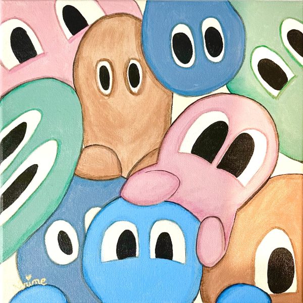 Cette œuvre colorée met en scène une joyeuse foule de visages stylisés, qui semblent se presser les uns contre les autres, comme surpris dans un instant de complicité. Les formes rondes, les regards expressifs et les couleurs vives — bleu, rose, vert, violet — créent une composition dynamique et ludique, immédiatement chaleureuse.